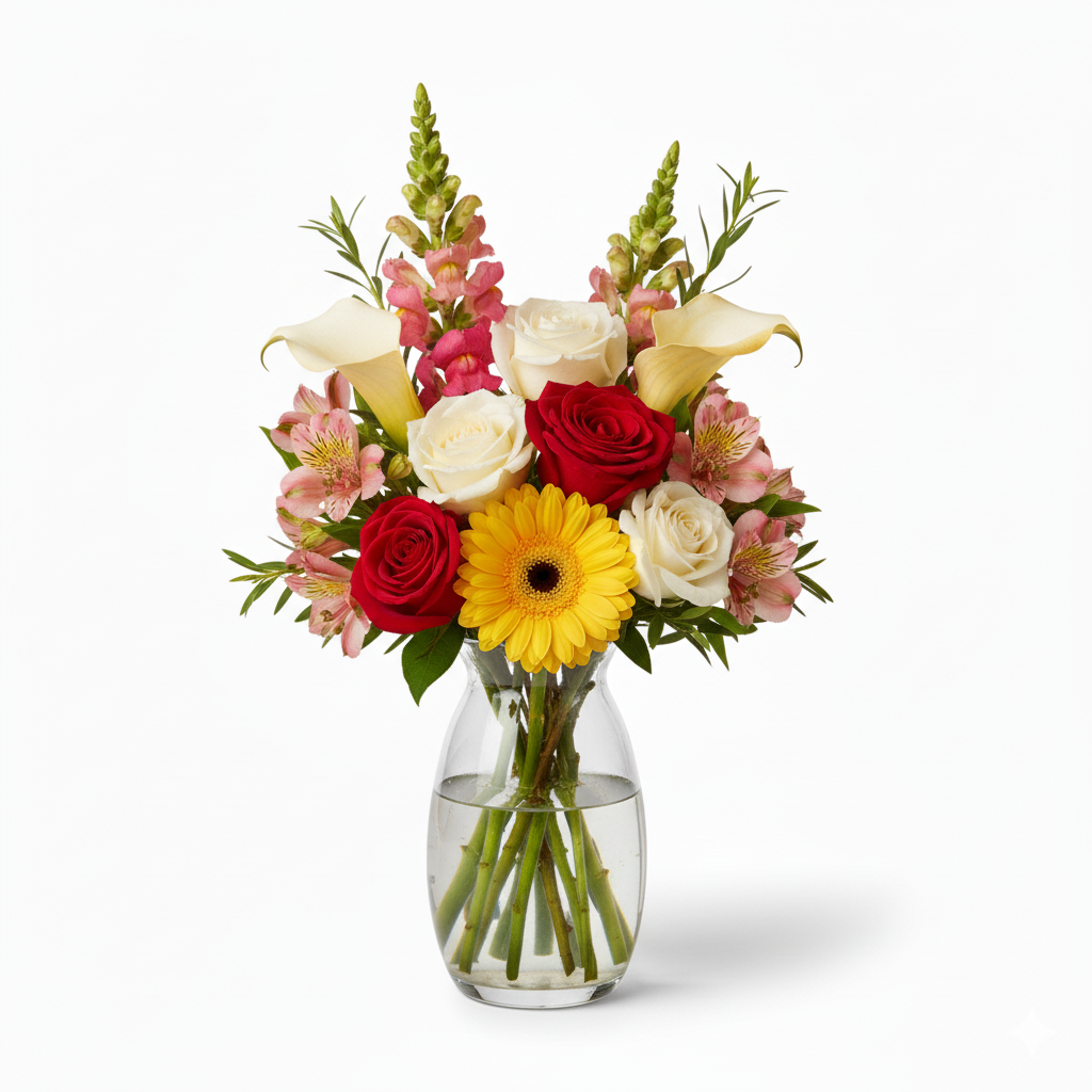 Shop this festive Christmas bouquet featuring yellow gerberas, red and white roses, calla lilies, pink alstroemeria, and snapdragons in a clear glass vase. Perfect for holiday celebrations or sending seasonal wishes across New Zealand.