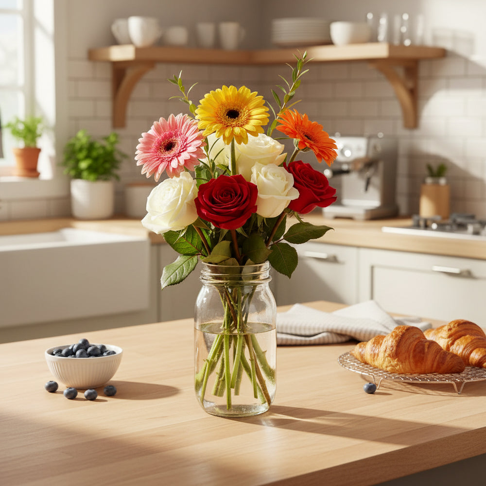 This larger mason jar arrangement includes red and white roses paired with pink, yellow, and orange gerberas and fresh greenery. With more blooms and greater color variety than our standard mason jar options, it delivers a bigger impact for the holidays. Bloomex NZ provides same-day and next-day delivery across the country.