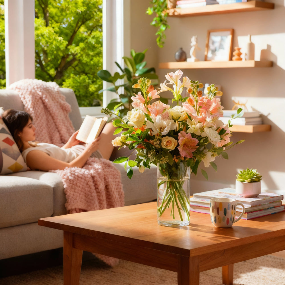 Delicate Elegance brings together white roses, pink and white alstroemeria, and white asters in an arrangement that's romantic without being over-the-top—perfect when you want to say something meaningful without saying too much.