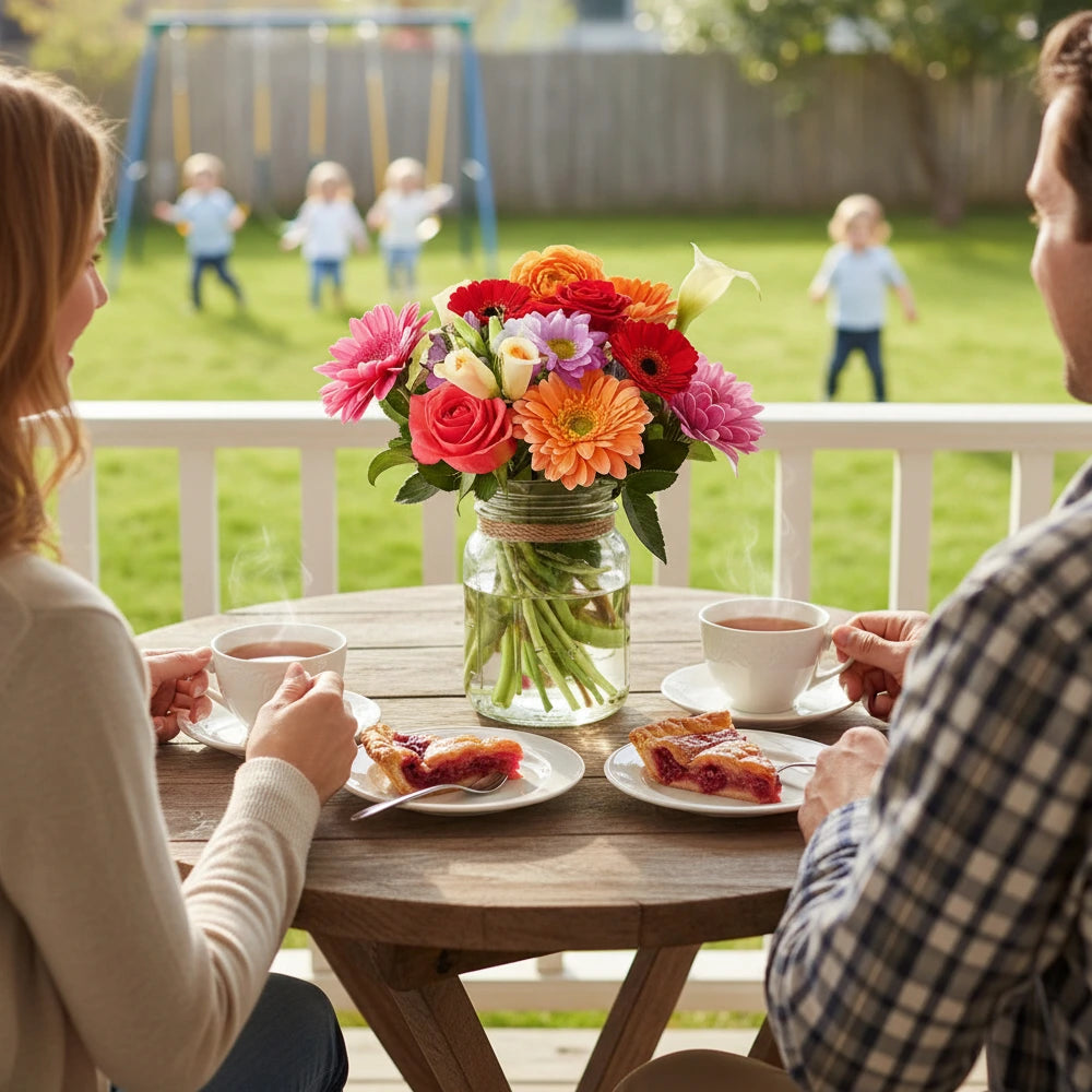 Bouquet includes Designers Collection of a beautiful mix of at least nine (9) stems; eight (8) stems of assorted, fresh cut, seasonal flowers (or a single type of flower, like Roses) and one (1) stem of complementary filler-greens carefully arranged in a trendy Mason Jar.  Includes full size Greeting Card to put your thoughts to paper.