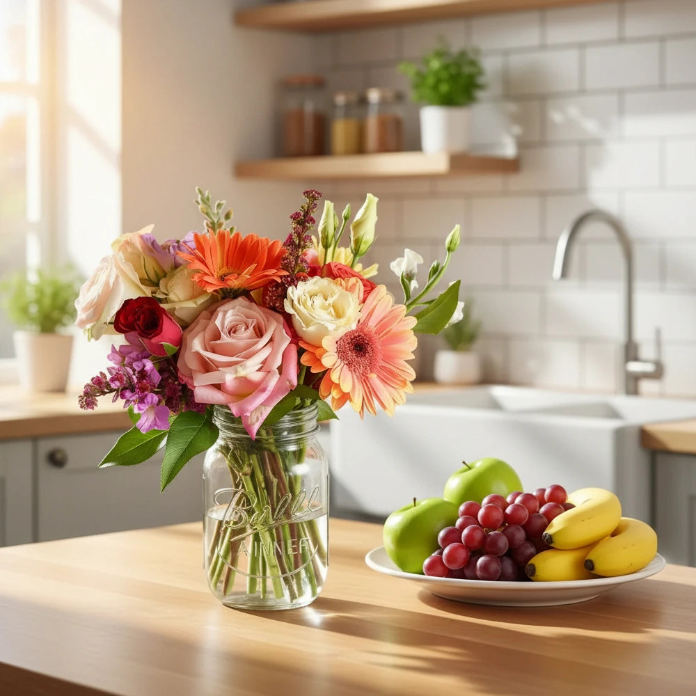 Bouquet includes Designers Collection of a beautiful mix of at least ten (10) stems; nine (9) stems of assorted, fresh cut, seasonal flowers (or a single type of flower, like Roses) and one (1) stem of complementary filler-greens carefully arranged in a trendy Mason Jar. Includes full size Greeting Card to put your thoughts to paper.