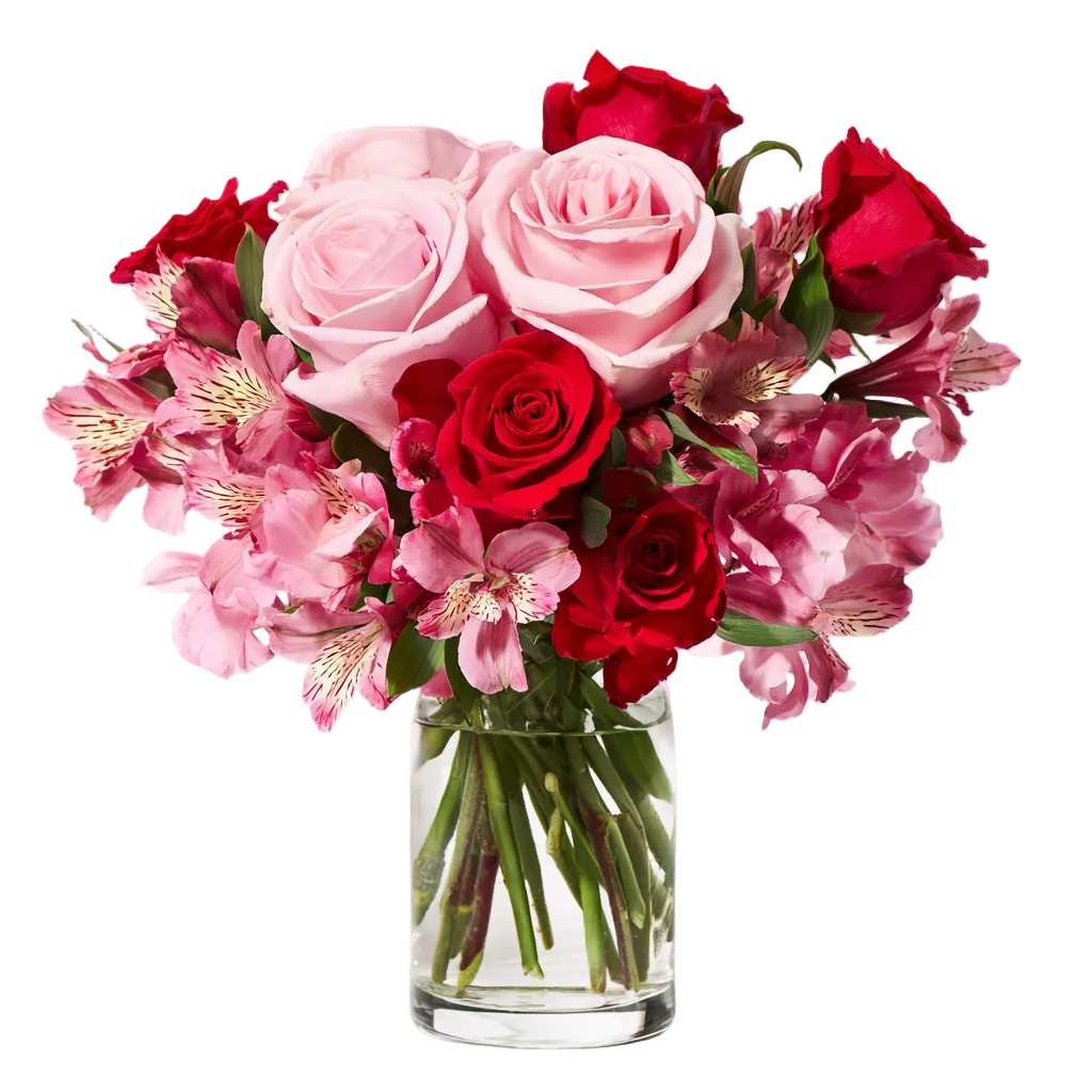 What you're getting: A generous hand-tied arrangement featuring mixed roses , pink alstroemeria, and fresh ruscus. Presented in a red flower box and wrapped in cellophane.