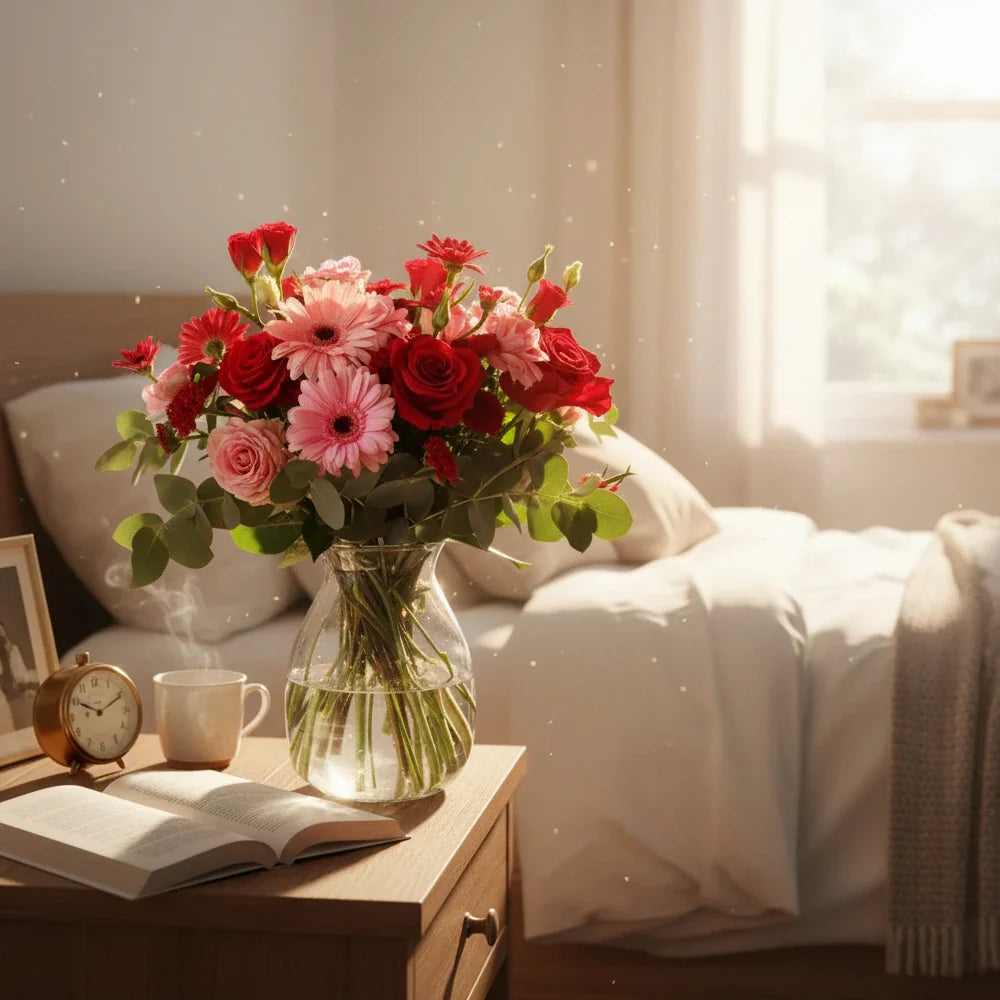 Illuminate and impress with the Just Because Bouquet, featuring a lush blend of red and pink roses, vibrant red alstroemeria, and cheerful pink gerbera daisies. This stunning arrangement combines elegance, passion, and joy, making it the perfect gift to express love and brighten someone's day.