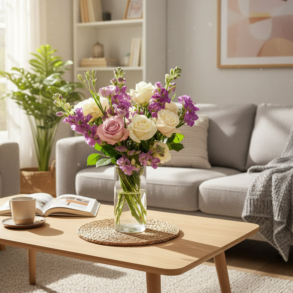 What's included: Hand-arranged lavender and white roses, alstroemeria, snapdragons, and fresh greenery.