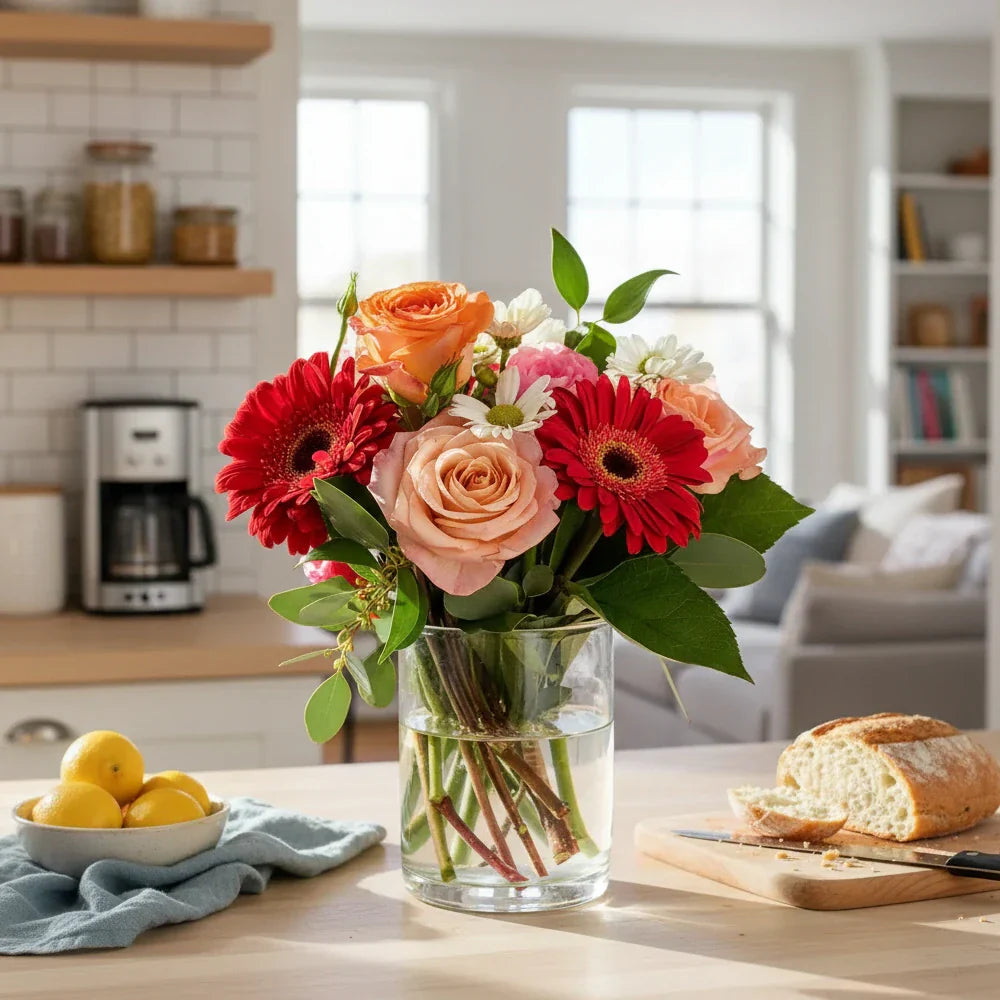 Introducing the Simply Sweet Bouquet – a charming arrangement that brings a burst of color and joy to any space. Featuring plump roses, vibrant gerbera daisies, and delicate alstroemeria, this small bouquet is perfect for adding a touch of natural beauty to your home or gifting to a loved one. Handpicked for their freshness and carefully arranged, these flowers radiate elegance and cheerfulness, making every moment brighter and more memorable.