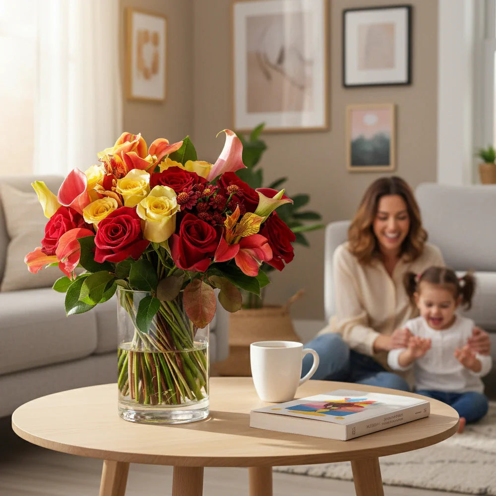 Vibrant and joyful. Red and yellow roses paired with yellow alstroemeria, pink calla lilies, and red asters create a warm, colorful arrangement. A standout choice as congratulations flowers or to brighten someone's day.