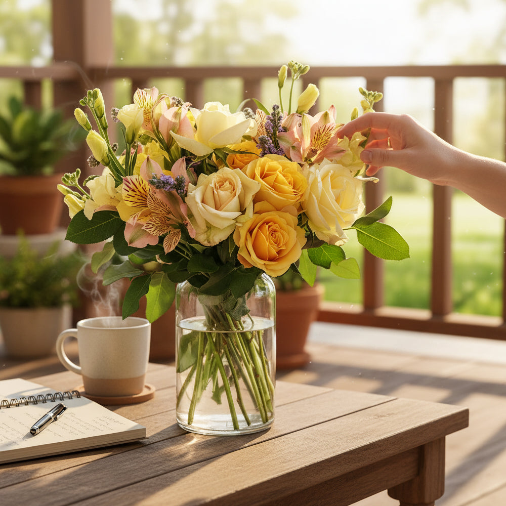 A delightful bouquet featuring plump orange and white roses, paired with pink and lavender Alstroemeria! Radiate warmth and tenderness with this charming arrangement, perfect for any occasion. Whether expressing love, gratitude, or friendship, these elegant blooms convey heartfelt emotions with every petal. Brighten someone's day with this exquisite combination of colors and fragrances. Order now and let your sentiments bloom!